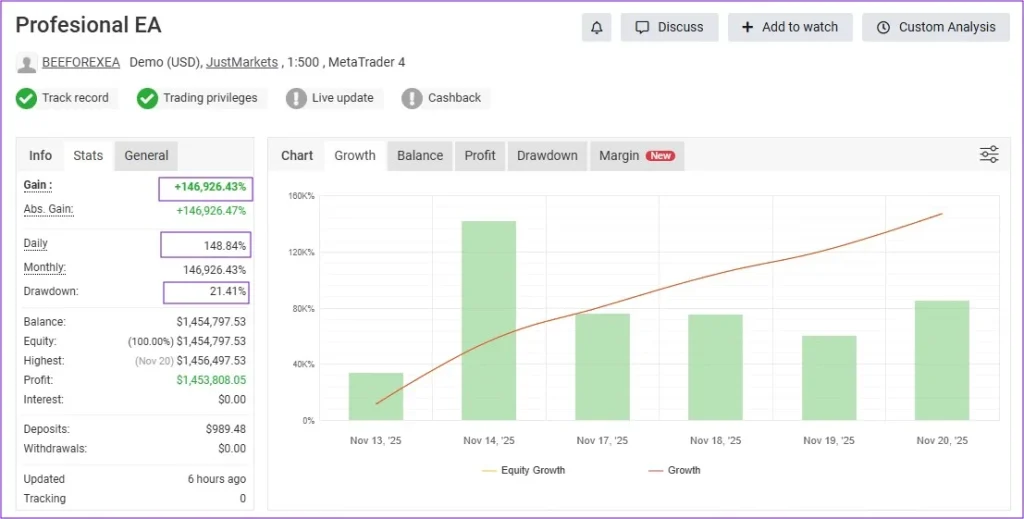 With more than 146,000% gain, 148% average daily gain, and 21.41% drawdown, this EA proves it can generate extreme returns at controlled risk levels when paired with proper broker conditions.
