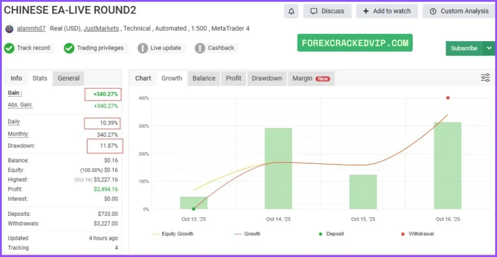 What makes this EA stand out is its transparent and verified performance on Myfxbook. The developer has shared multiple live and demo accounts to showcase how the system performs in different conditions.