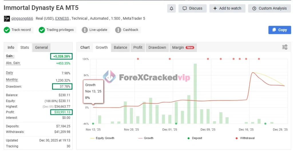 Performance transparency is one of the strongest points of this EA. The developer provides verified Myfxbook tracking, allowing traders to independently analyze growth, drawdown, and trading history.
