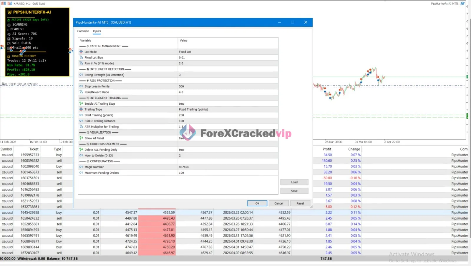 PipsHunterFx-AI MT5 appears to be an automated trading system for MetaTrader 5 focused on XAUUSD on the H1 timeframe. Based on the provided screenshots, the system includes a visible AI panel, trading history, detection logic, risk settings, trailing controls, and pending order management.