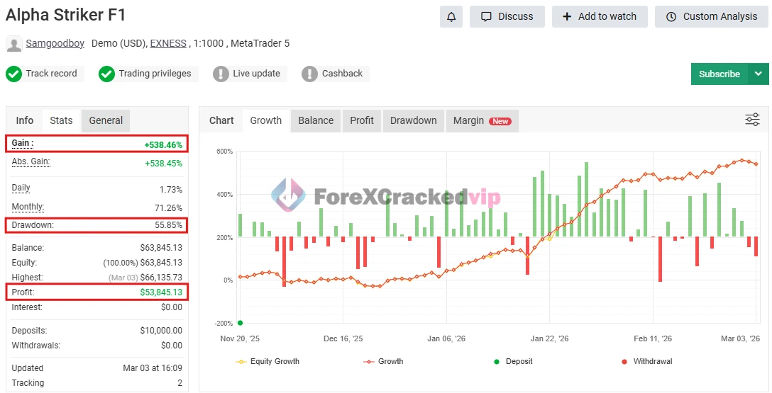 Alpha Striker F1 MT5 2026 NEW – MYFXBook Gain 538% | Advanced Gold & Bitcoin Automated Trading EA