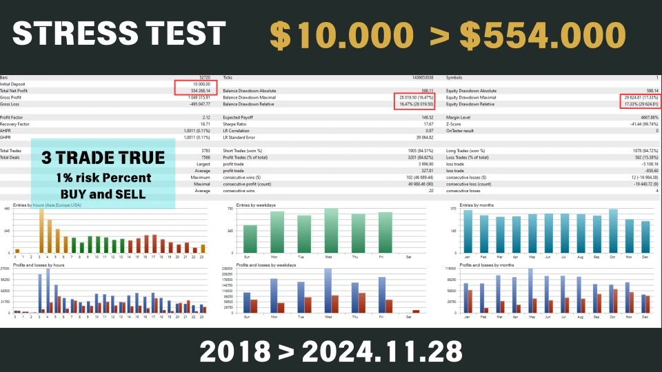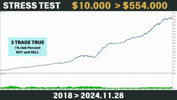 This long-term stress test proves the EA’s ability to handle varied market conditions while maintaining low drawdown and high profitability.