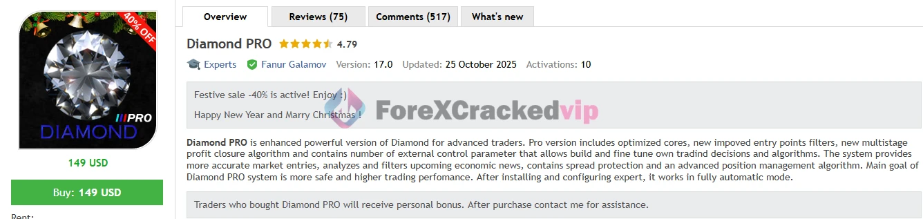 Among his portfolio, Diamond Pro MT5 stands out as his best-performing and most refined product, built on years of optimization, real-market testing, and trader feedback.