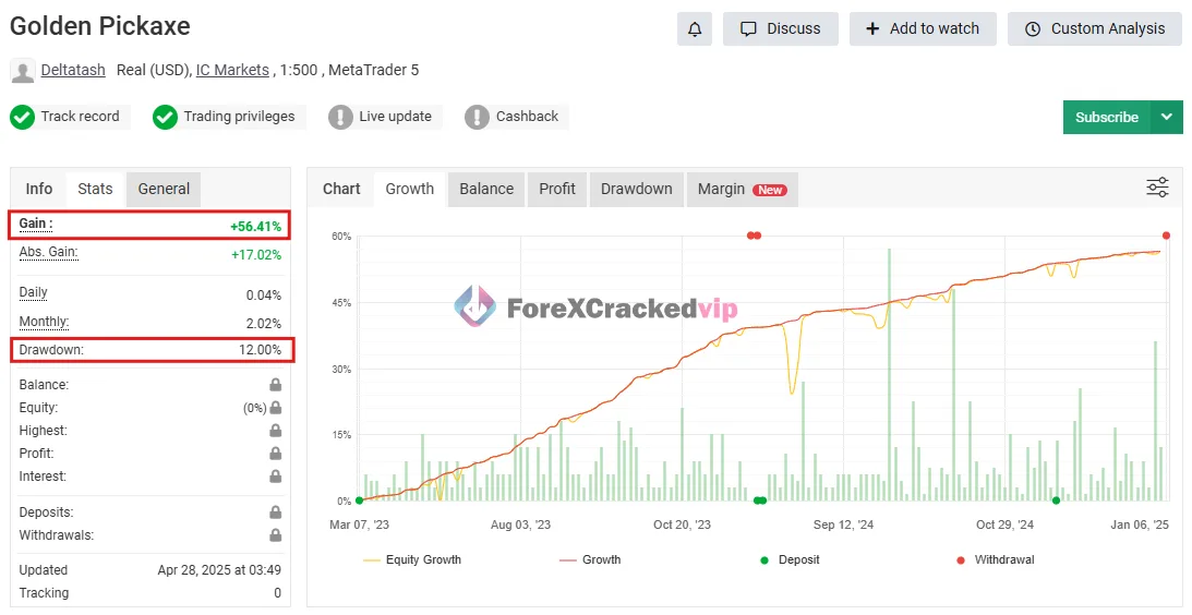 Golden Pickaxe EA MT4 V2.23 – MYFXBook 56% Gain | 12% Drawdown | Unlimited