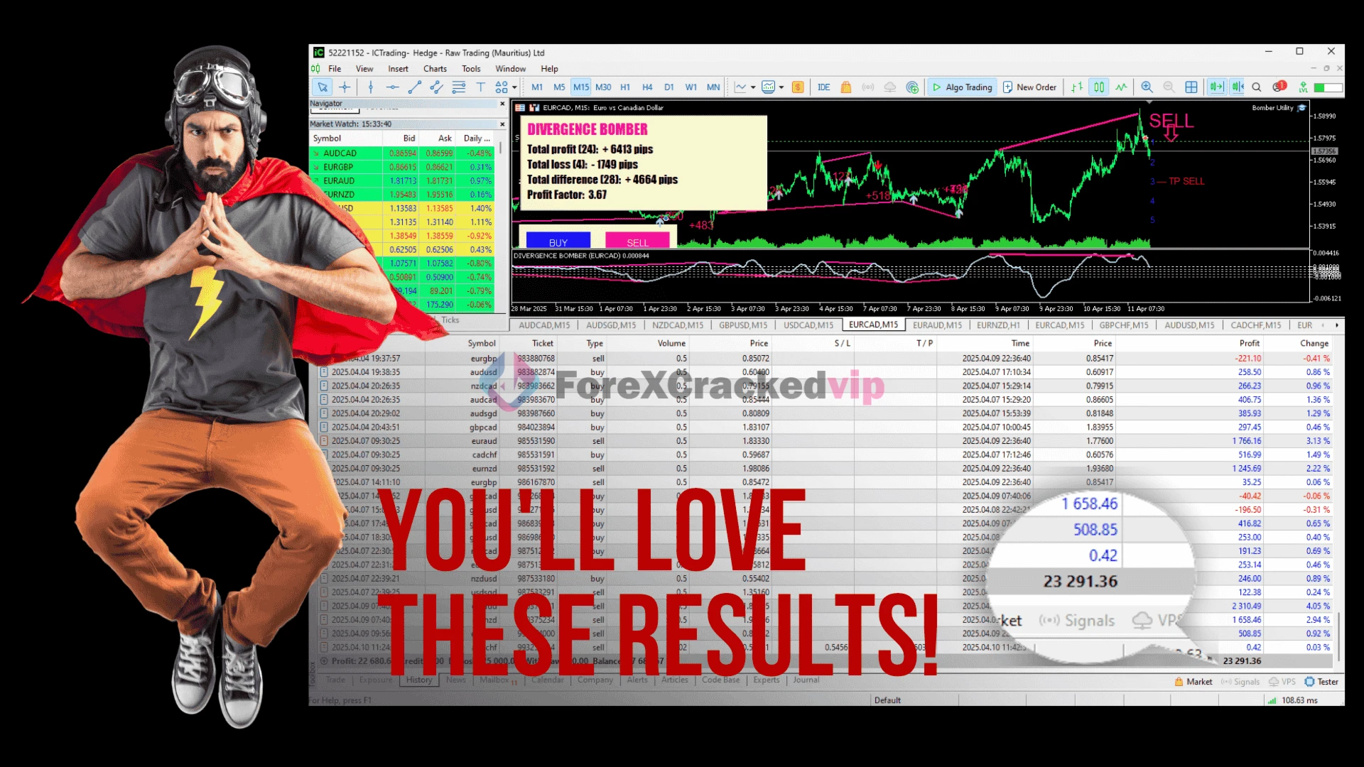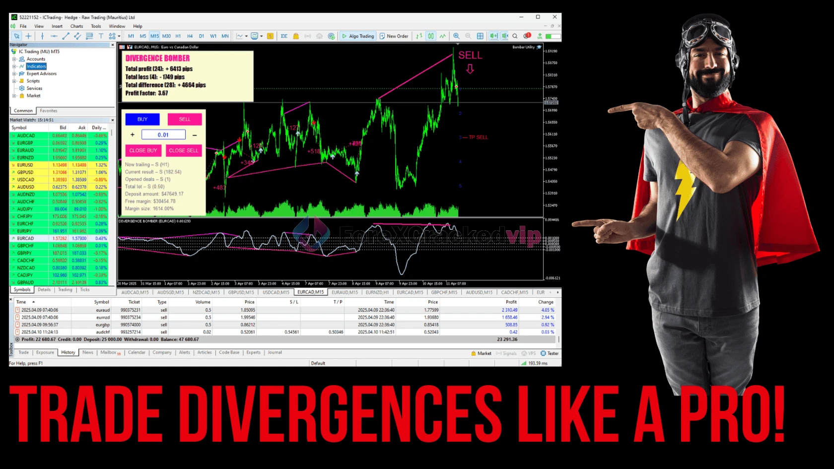 Divergence Bomber MT5 is an All-in-One trading system indicator detecting MACD divergences with 98%+ average signal accuracy. Includes FREE Bomber Utility that automatically manages trades, sets SL,TP, and closes positions according to strategy rules. Supports 20 forex pairs EURUSD, GBPUSD, AUDUSD, USDCAD, plus 16 others, across 3 timeframes, M15, H1, H4. Features stop loss integration, dynamic trade closure for drawdown, push notifications. Includes set files for all assets, 3 risk strategy modes with Genuine product key & original license key.