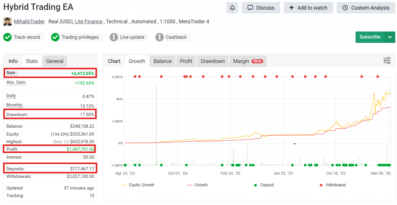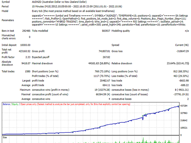 Hybrid Trading RSI Divergence MT4 is an automated Forex trading robot for MetaTrader 4. The EA uses advanced RSI divergence detection to identify potential market reversals and automatically open trades. It includes trailing stop profit management, martingale recovery logic, and built in risk management. The system supports multiple currency pairs and works best on the M15 timeframe with small accounts.