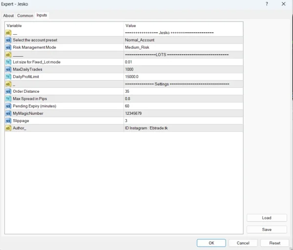 🔄 Restart MT4 and drag Jesko EA onto the XAUUSD M1 or M5 chart.