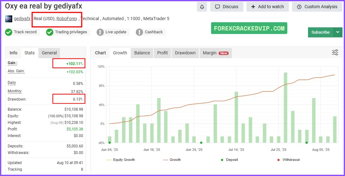 With real Myfxbook-verified gains of 102%, low 6.13% drawdown, and steady monthly growth of 37.82%, Oxy EA MT4 proves itself as one of the best Gold EAs for 2025. Whether you want to buy, download, or test it on your funded account, this EA offers excellent performance with a low-risk strategy.