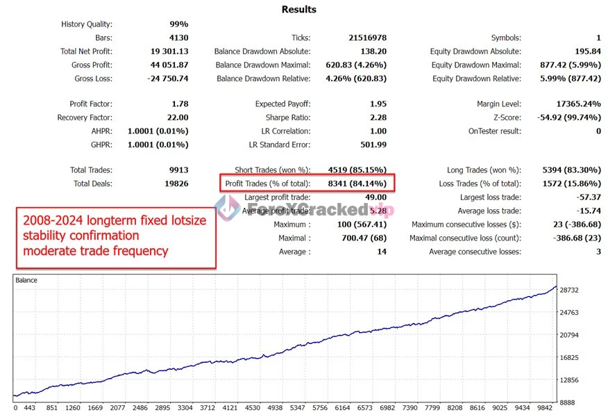 That means the strategy is not just about finding movement. It is also about trying to survive the bad periods while still participating in the strong ones. This is likely why the developer emphasizes controlled drawdown and fast recovery rather than only showing raw profit numbers.