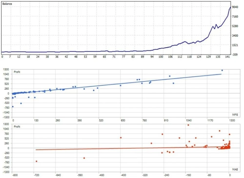 This report shows the balance curve together with MFE and MAE style profit scatter plots. It matters because it gives a quick read on growth shape, trade efficiency, and how far trades move in favor or against the position.